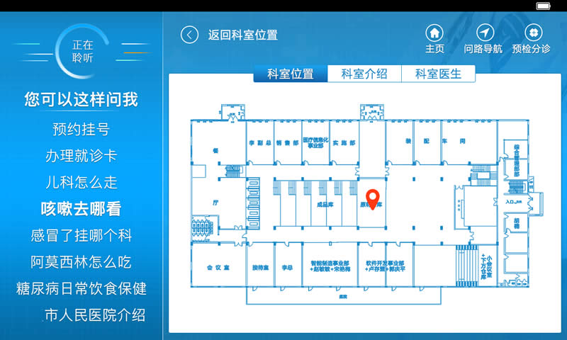 這些問題機器人都能告訴您答案,患者說到“以前都沒有在醫院見過機器人,它好可愛啊,還這么專業這么智能,太厲害了。以前看病總是不知道要去哪個科室,也不清楚科室對應的位置方向,在導醫臺咨詢排隊要排好久,有了這個機器人后看病咨詢更加方便了。”