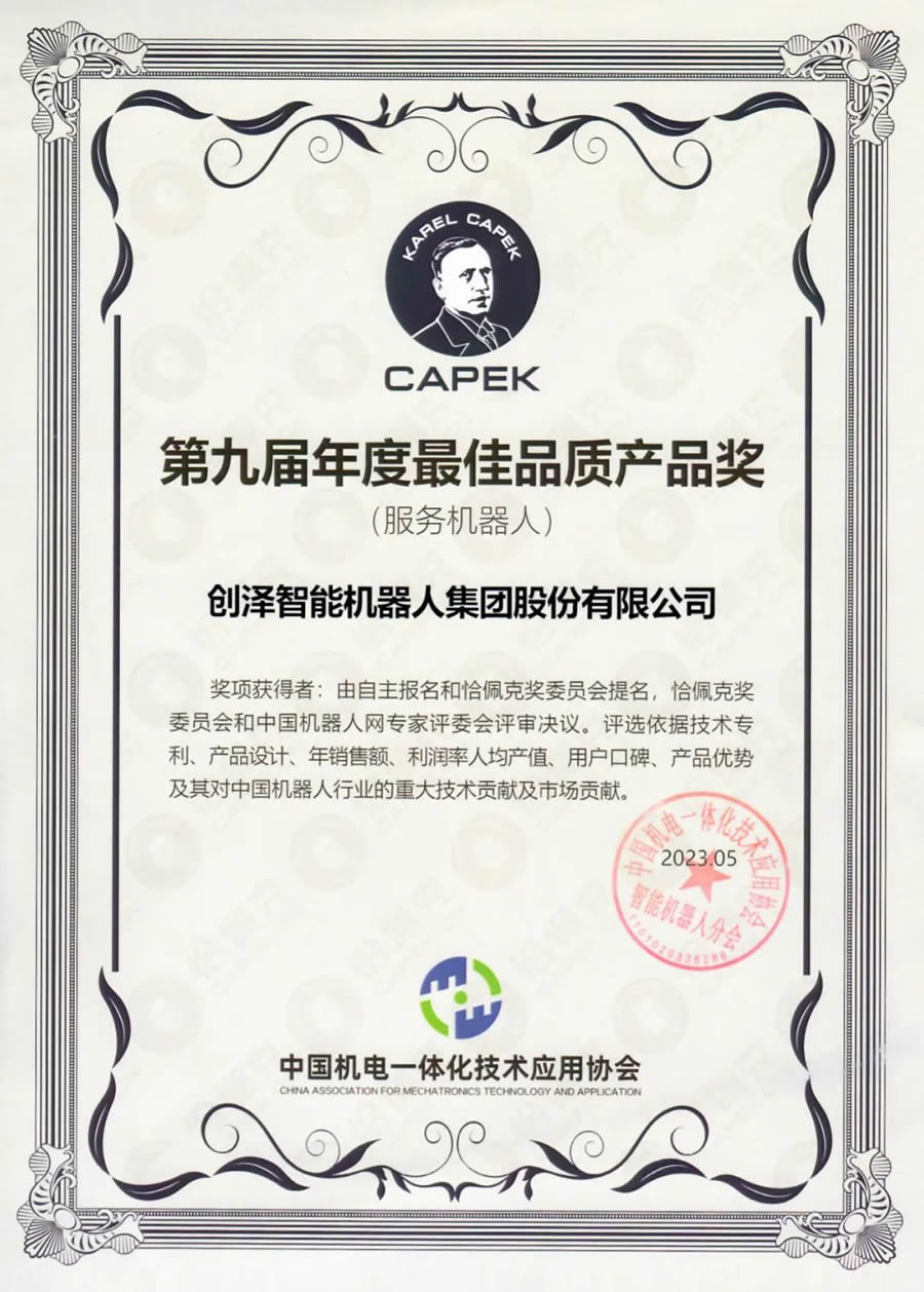 創澤集團作為商用服務機器人行業L軍企業,受邀參加本次G峰論壇。憑借多年在人工智能服務機器人L域深耕的綜合實力、創新技術和豐富的項目落地案例,實力斬獲恰佩克“第九屆年度佳品質產品獎”。
